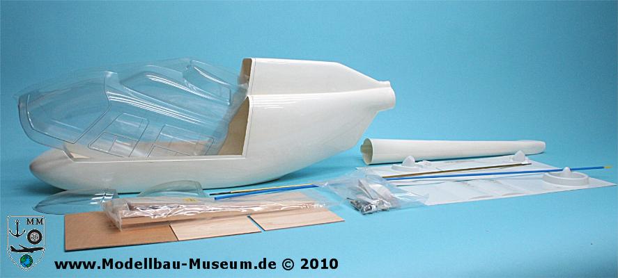 Ich hatte seinerzeit mehrere teilgeplünderte Mechanik-Baukästen vom System 80 gekauft. Diese habe ich einmal durchgesehen und mit meinen Ersatzteilen vervollständigt. So auch diesen. Der Rotorkopf ist in Rigid-Ausführung, d. h. Direktansteuerung ohne Hiller-Paddel. Deshalb gehören selbstverständlich auch gewichtsoptimierte Rotorblätter bei.Generell sind die Rumpfbausätze für das System 80 sehr selten, aber bei diesem habe ich mich besonders schwer getan. Als erstes habe ich versucht aus Ersatzteilen einen zusammen zustellen. Bei Robbe waren damals noch einige erhältlich. Bis auf den Heckausleger war mir das auch geglückt. Dann habe ich einen gebrauchten gekauft. Und irgendwann konnte ich ihn bei einem Händler, ich glaube es war bei Modellbau Wachinger (Rosenheim), endlich einen kompletten Bausatz auftreiben.
