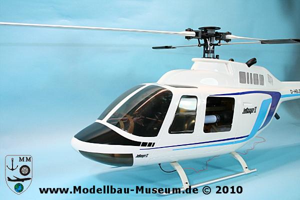 Dieser Hubschrauber-Typ ist in der zivilen Luftfahrt einer der am meist verbreitesten überhaupt. Da er auch sehr häufig als Vorbild für Bausätze dient, werden Sie diesen Satz des öfteren lesen. Dieses Modell ist aus einem Bausatz der Fa. Robbe entstanden. Der beiliegende Dekorsatz wurde verwendet. Ob dieser einem realem Vorbild entspricht, ist uns nicht bekannt. Aber da das Design recht ansprechend ist und so oder ähnlicher Weise häufig vorzufinden ist, wurde die Wahl schnell getroffen. Inwieweit der Rumpf maßstabgetreu ist, kann ich nicht sagen, da es damals mein Wunsch war, möglichst schnell einen vorbildähnlichen Rumpfbausatz aufzubauen und zum fliegen zu bringen und da war die Scale-Eignung für mich von untergeordneter Bedeutung. Zitat Robbe-Katalog: "Der GfK-Komplettbaukasten ist für den Einbau einer Futura-Mechanik vorgesehen und für ein Rumpfmodell mit ungewöhnlich wenig Bauaufwand verbunden. Durch die hohe Vorfertigung des GfK-Rumpfes mit eingesetzten Passdübeln und dem einfach zu montierenden Starrantrieb, läßt sich dieses Modell binnen weniger Stunden aufbauen."Als Empfohlene Mechanik war die Futura-Contest angegeben. Verwendet habe ich hier die Vorgängerversion die Rumpfmechanik.